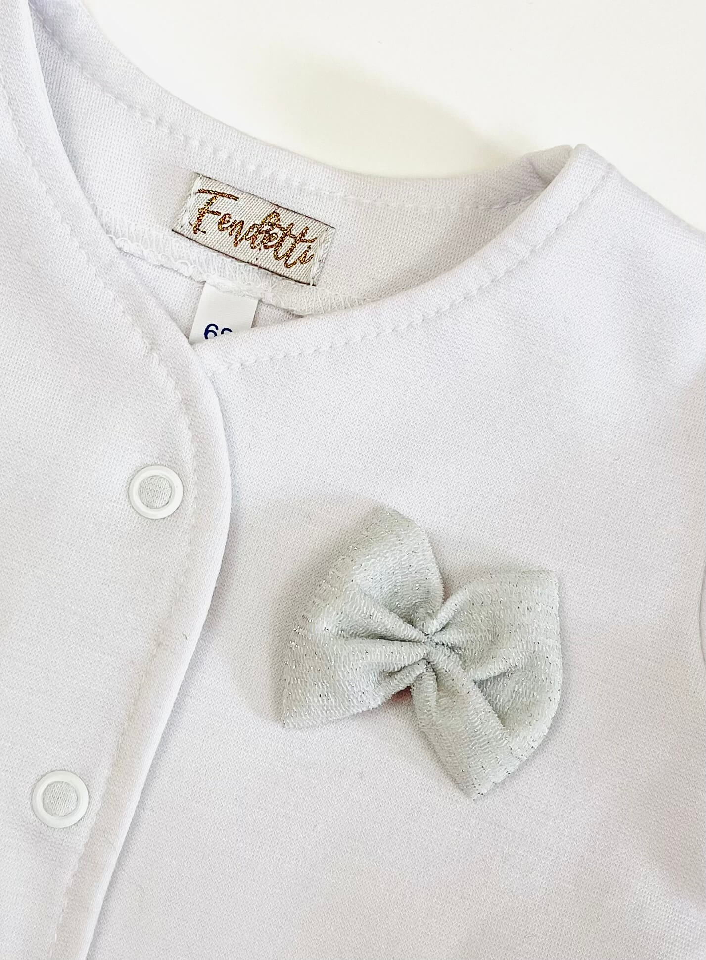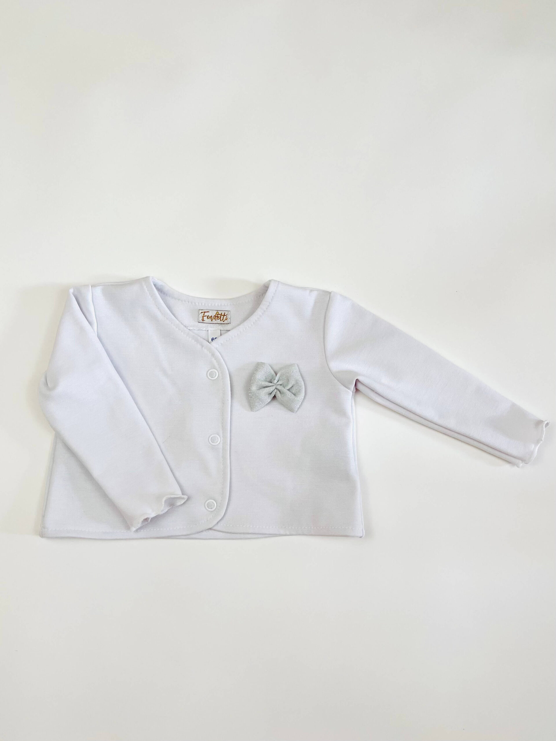 Kislány kabátka, hosszú ujjú, fehér színű, különleges, rugalmas anyagból. A kabát elöl patentos, sima ujjú. Az elején ezüst csillámos tüll anyagból készült masni díszítés van.