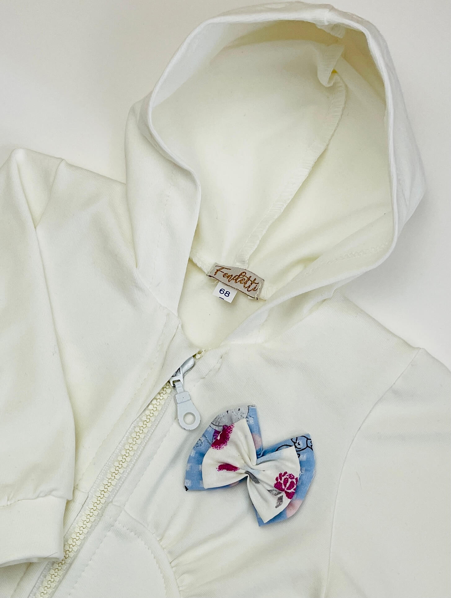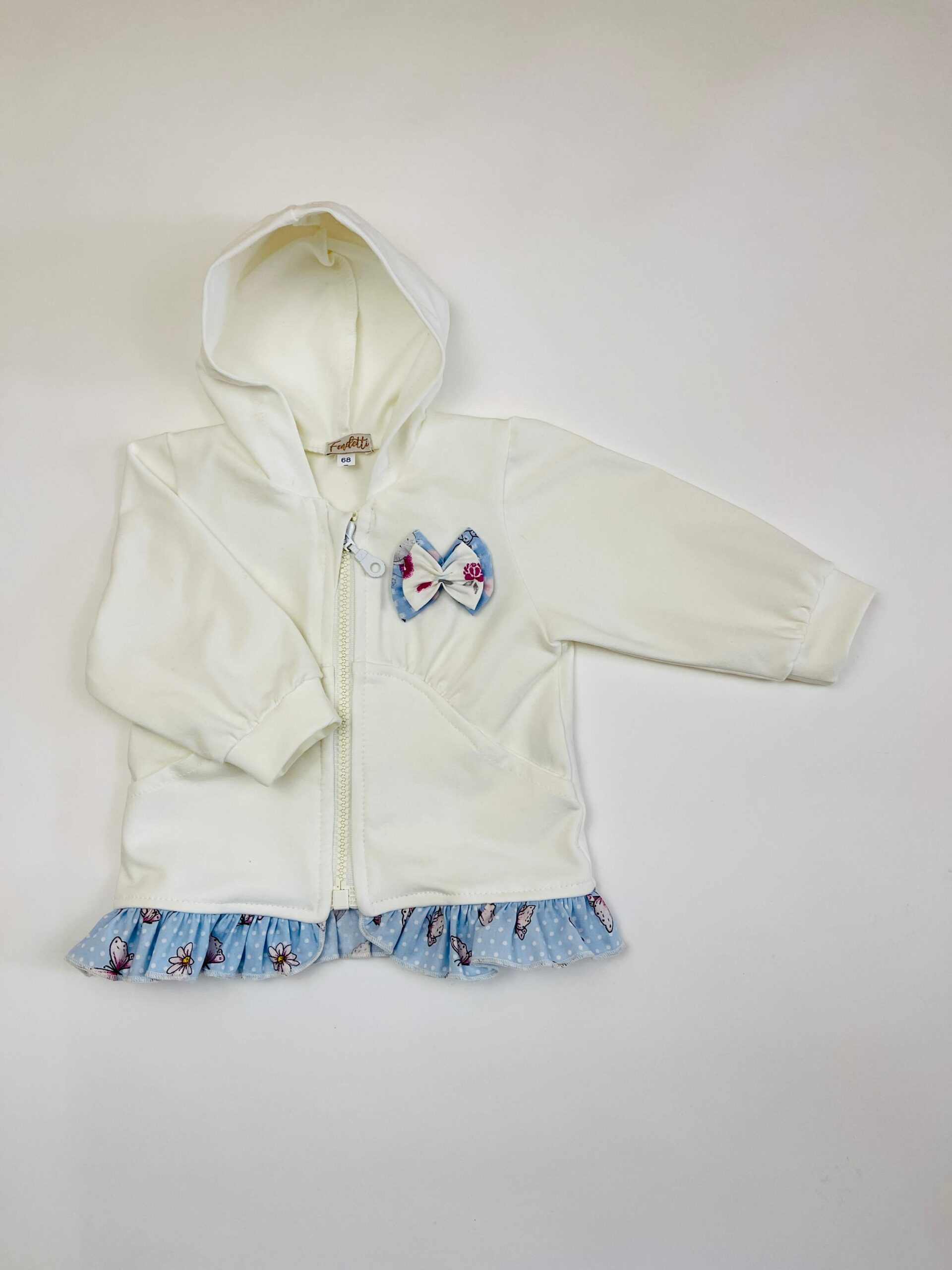 Az elefántcsont színű pulcsi nagyon jól kihasználható ruhadarab, nem hiányozhat egyetlen baba ruhatárából sem. Bababarát őkopamutból készült, kapucnis, cippzáros, alján körben világoskék mintás pamut anyaggal van díszítve. A pulcsi zsebes, zseb körül húzott, ez adja meg a felső különlegességét, egyediségét. Elején a fodorral harmonizáló 2 féle világoskék mintás pamut masni díszítés van. Camilla ruha család minden termékéhez passzol.